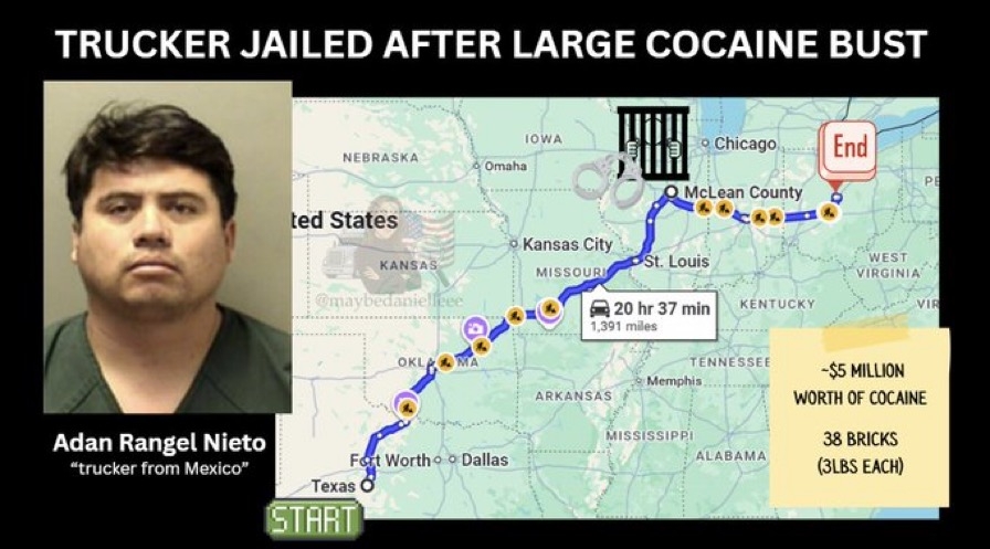 Oct. 8, on I-55, Illinois State Police found 38 bricks, each weighing three pounds, in the cab of Adan Rangel Nieto’s semi.